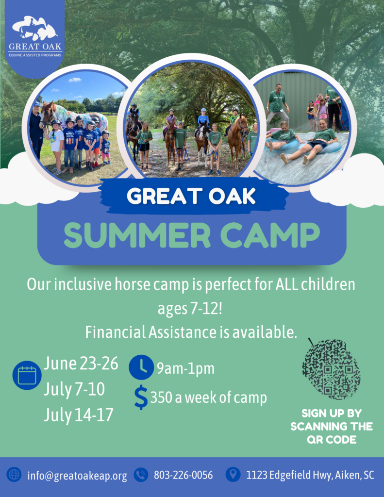 Come join Great Oak for the Summer! Perfect place to be introduced to the wonderful world of horses. No experience necessary! These are inclusionary camps for riders of all abilities, and are open to anyone ages 7-12. You’ll learn how to groom, feed, tack up, horse care, ride and so much more. With 45 acres to explore, keep cool in an indoor arena with fans, a nature trail, Great Oak is the place to be this summer!